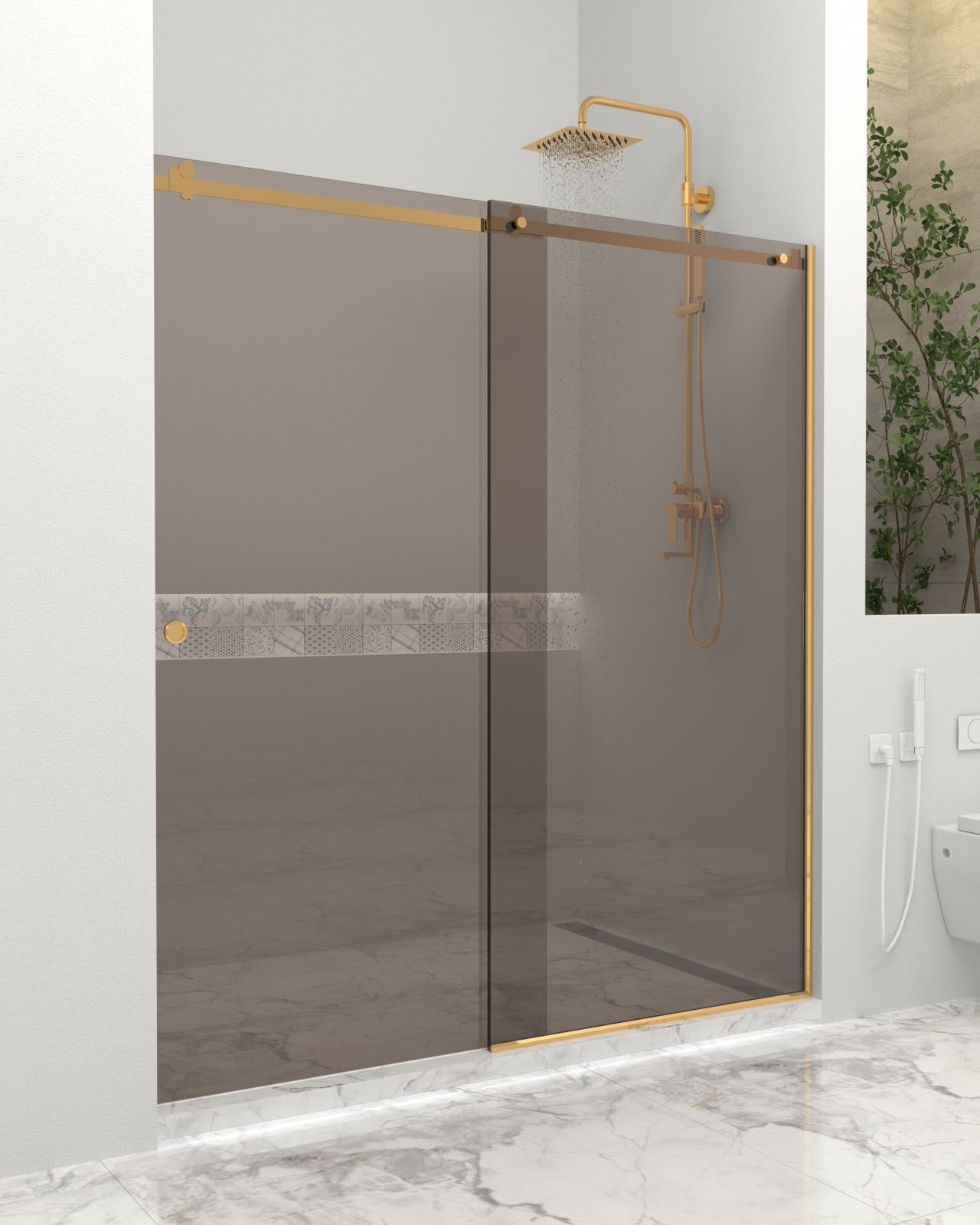 Paravan dus cu usa culisanta, Sticla bronze de 8 mm, Accesorii Feronerie Auriu, 130 - 140 x 200 cm
